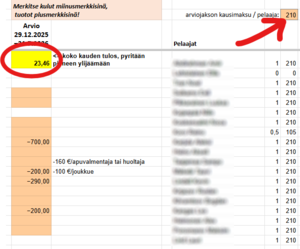 - Arvioi kevään pelaajakohtaisen kausimaksun suuruus oikealla ylhäällä olevaan oranssiin ruutuun. Etsi kokeilemalla sellainen luku, jolla kustannuspaikan koko kauden tulos (keltainen ruutu) menee jokusia kymppejä plussan puolelle.