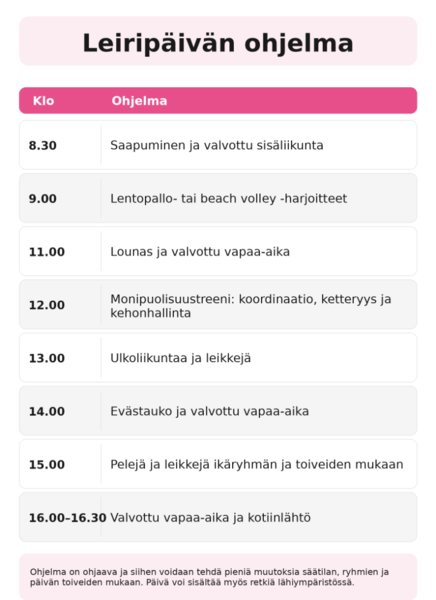 Leiripäivän varsinainen ohjelma on klo 9.00–16.00. Leiriläisen voi tuoda paikalle klo 8.30 alkaen ja noutaa viimeistään klo 16.30.